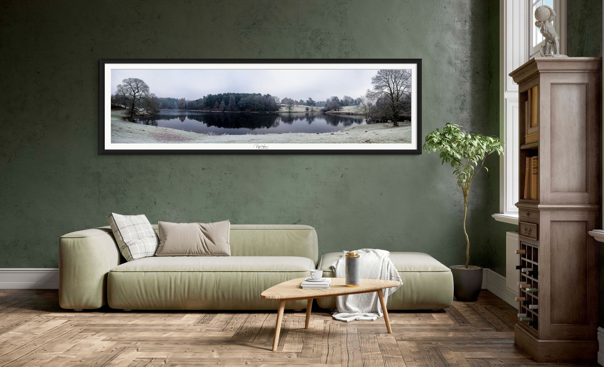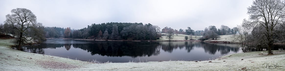 This large 4:1 ratio signed open edition panorama photography print was taken on a frosty winters morning of the Dudmaston Hall Estate which is cared for by the National Trust. The image captures the views across the Dudmaston Big Pool looking towards the Hall showing the scale of the estate. This is a very high resolution image and needs to be viewed and printed as large prints is therefore reflected in the price.
