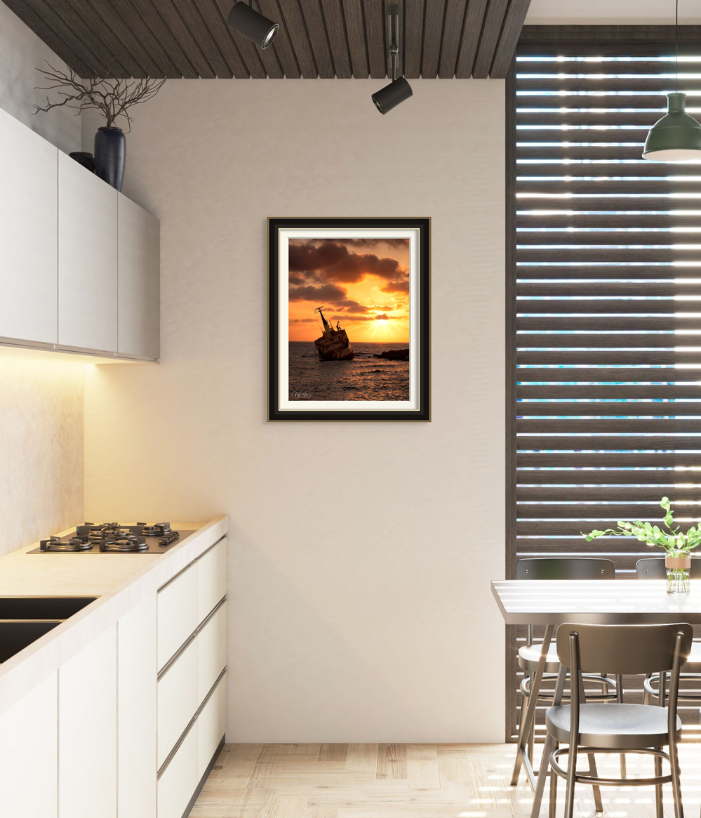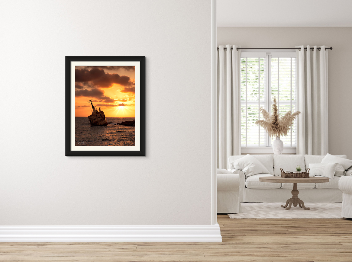 This Limited edition print of the Edro III Shipwreck, Peyia, Cyrus was taken 20 minutes before sunset with a brilliant yellow sky just before the sun disappeared below the horizon. This was taken on the first evening at this location where I couldn’t get the composition I wanted due to too many people around so opted for this view using a 70-200mm lens.