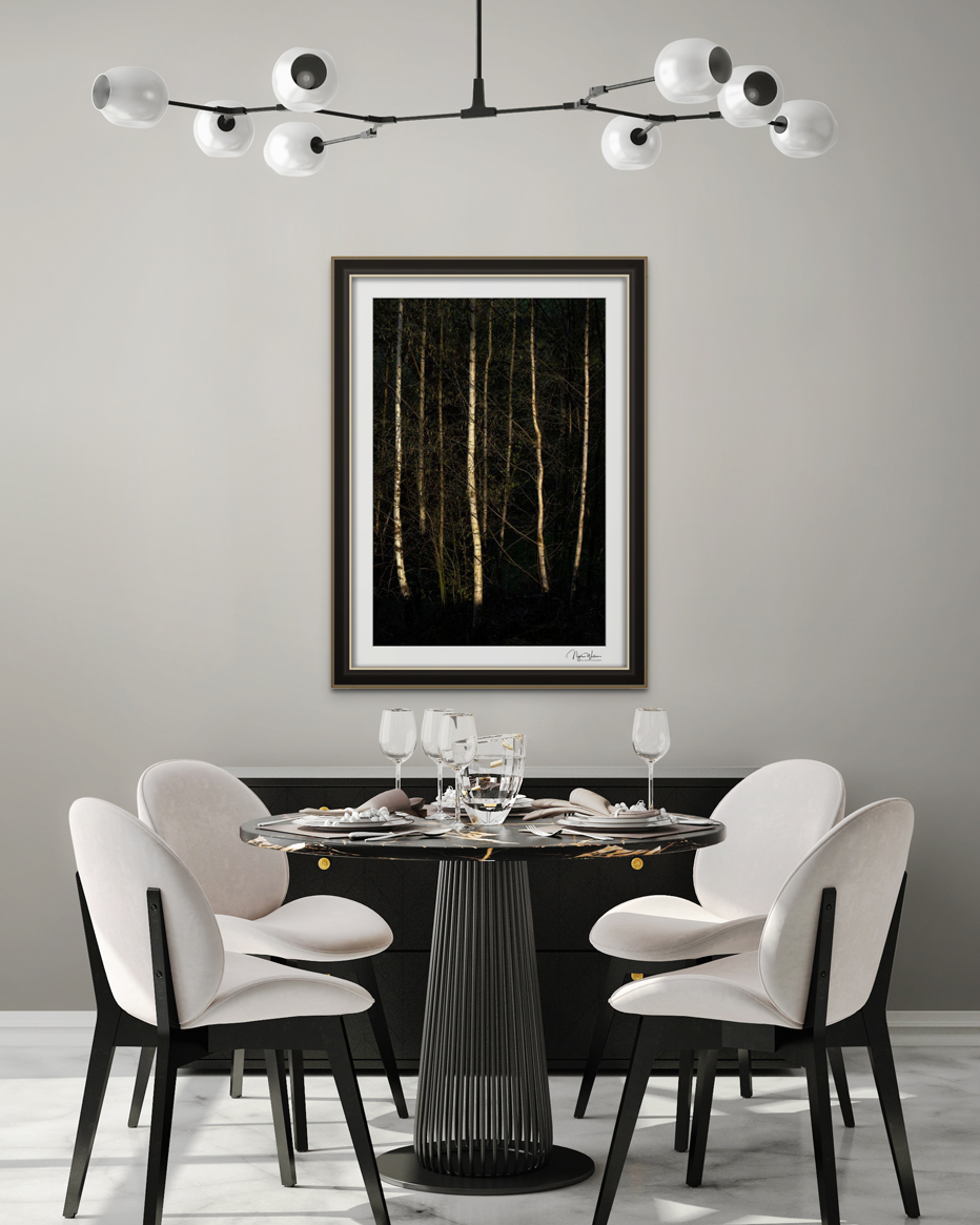 A photograph of Silver Birch trees illuminated by early morning spring sunlight titled Enlightened Erebus. The image was taken in my favourite local woodland located in Worcestershire early in the month of April.