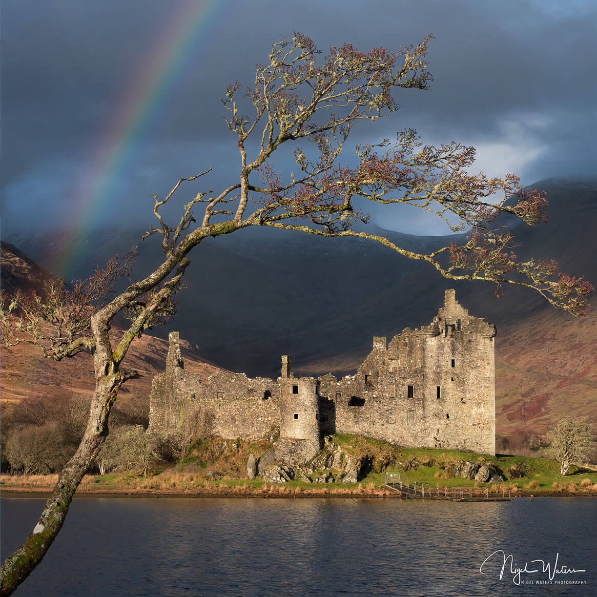When I arrived at the loch there wasn’t a ripple on the water and the glass surface was producing a wonderful reflection of the castle. However in typical Scottish weather style during winter by the time I got my camera out the rain started to fall shortly followed by hail. After an hour of me getting soaked and carefully framing the castle with a tree on the adjacent shore of the loch the sun began to break through illuminating the castle in a bright warm light shortly followed by a vibrant beautiful rainbow.