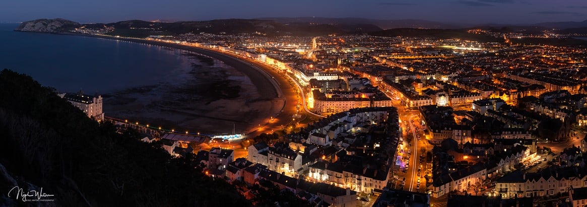 Llandudno illuminated by the town lights during blue hour. This is a 17:6 Ratio Panorama.