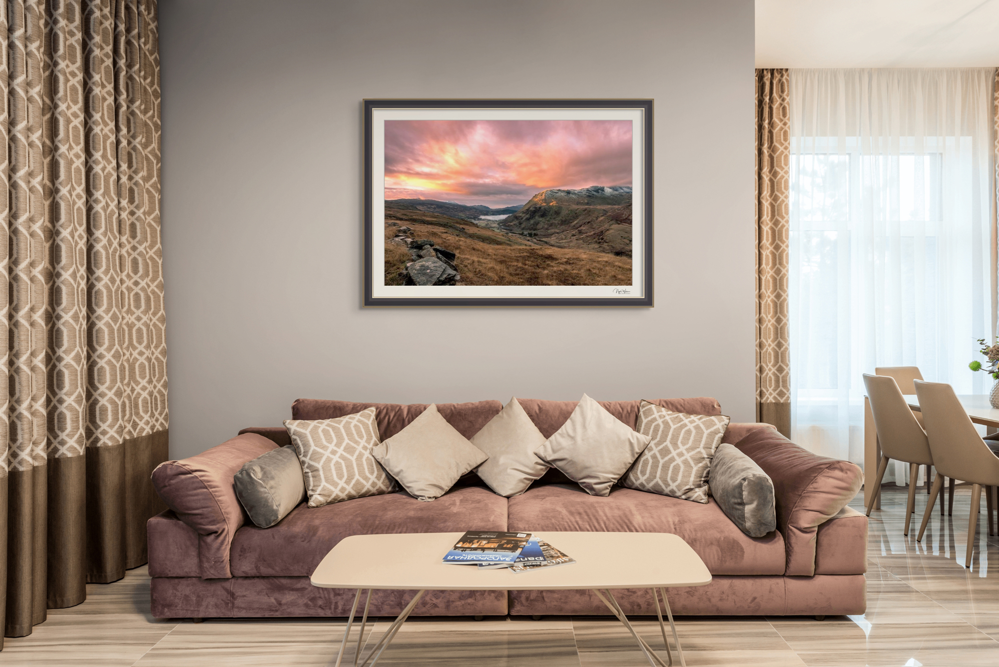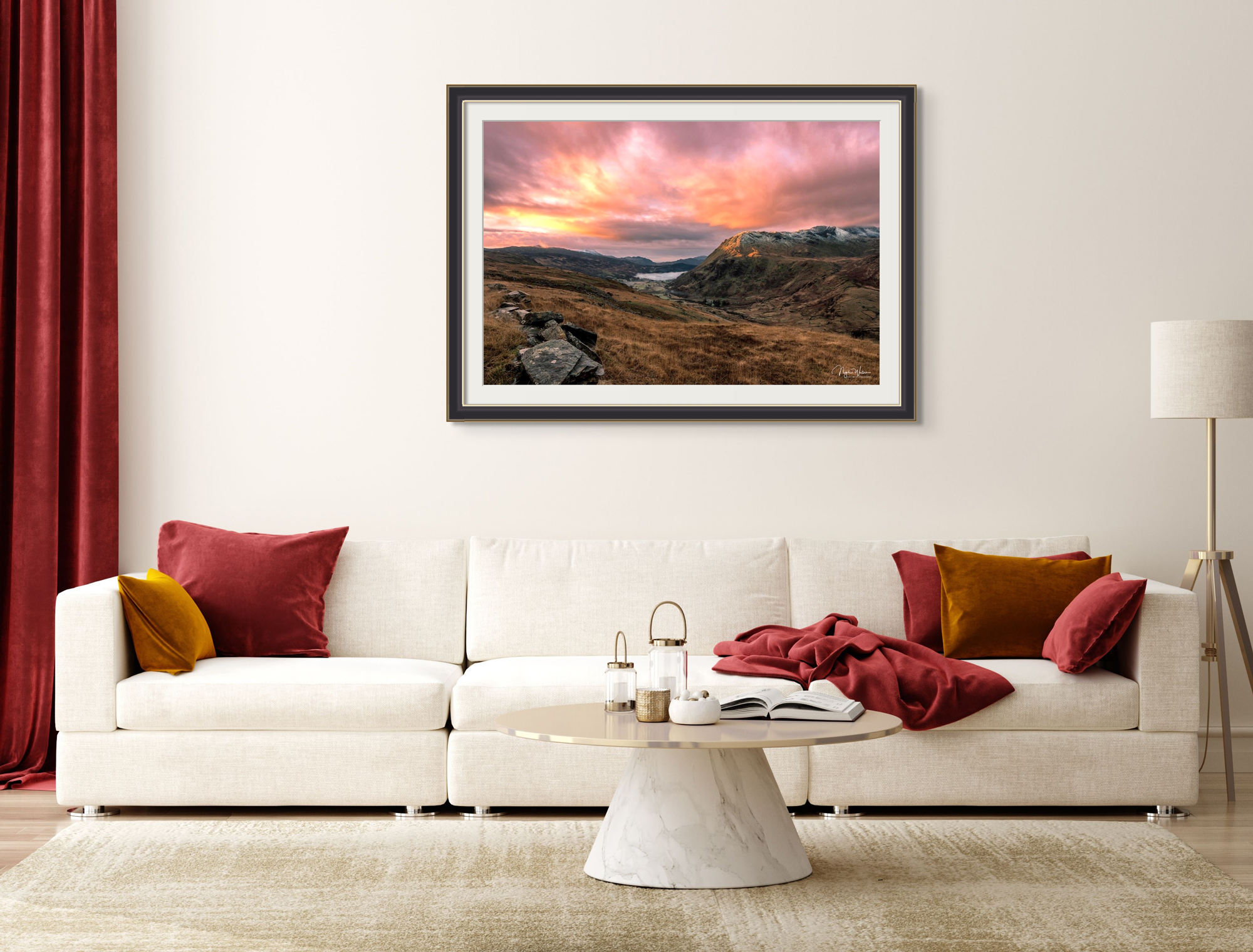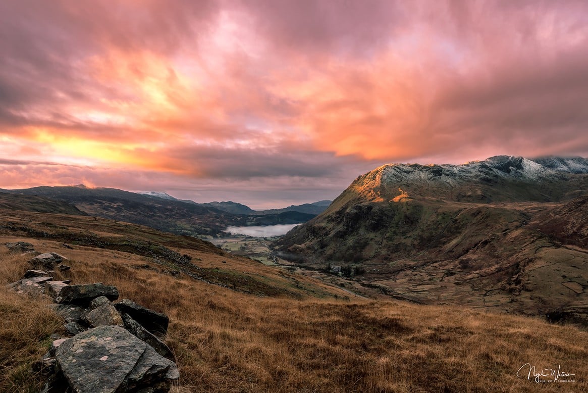 Limited Edition Fine Art Print of a stunning sunrise over Llyn Gwynant Valley and the snow capped Snowdon Mountain Range in Snowdonia, North Wales.