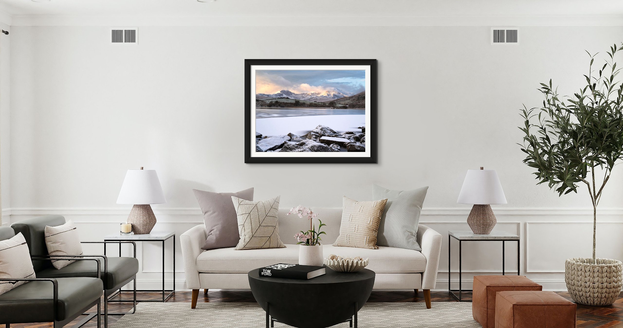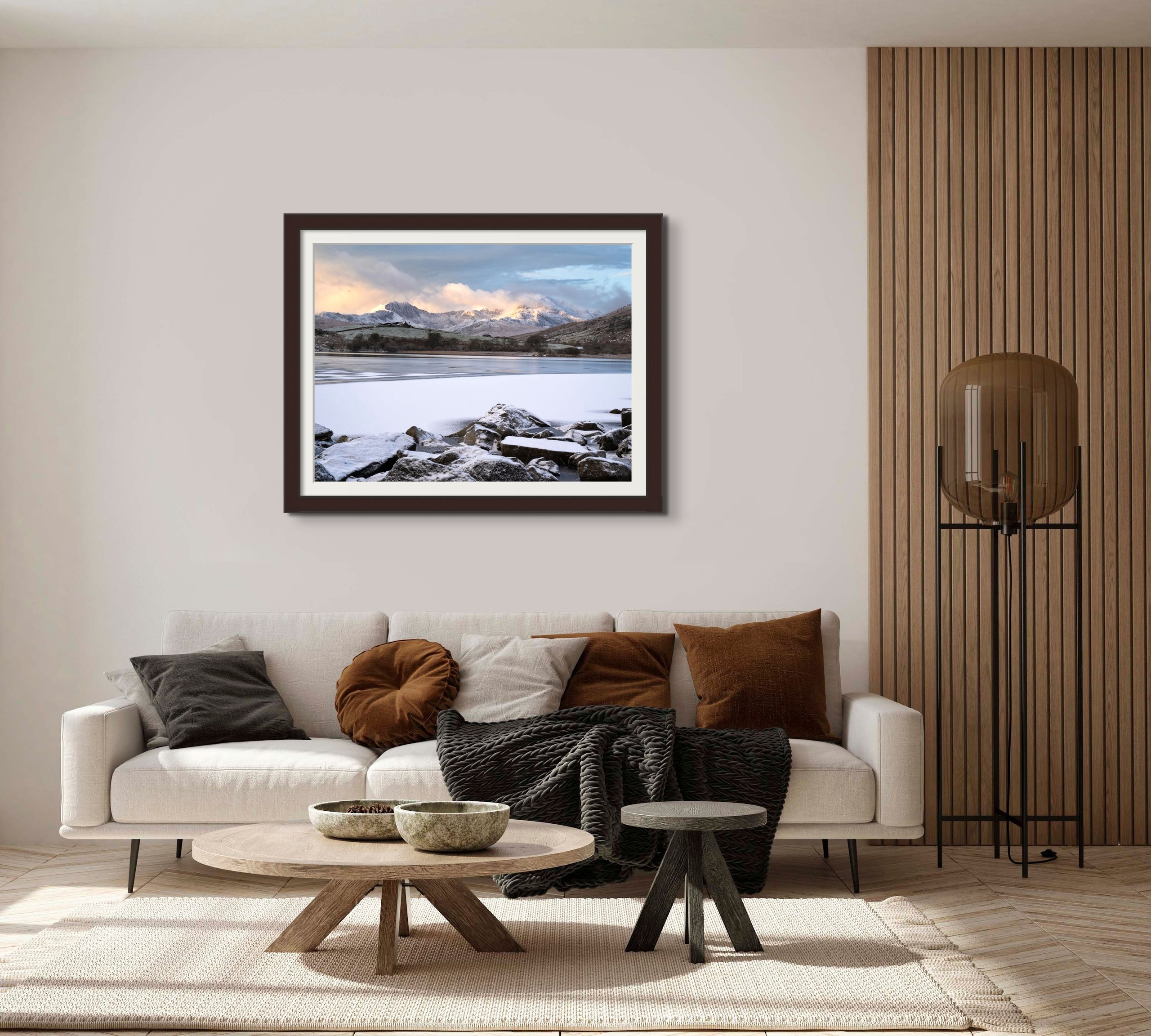 ‘Llynnau Mymbyr Sunrise’ is a photographic print that transports you to the heart of Eryri National Park’s during sunrise on a cold winters morning. As the sun gently ascends, frozen lake Llynnau Mymbyr comes to life with exquisite patterns anchoring the frame reflecting the golden hues of the illuminated clouds above the majestic Eryri Mountain Range.