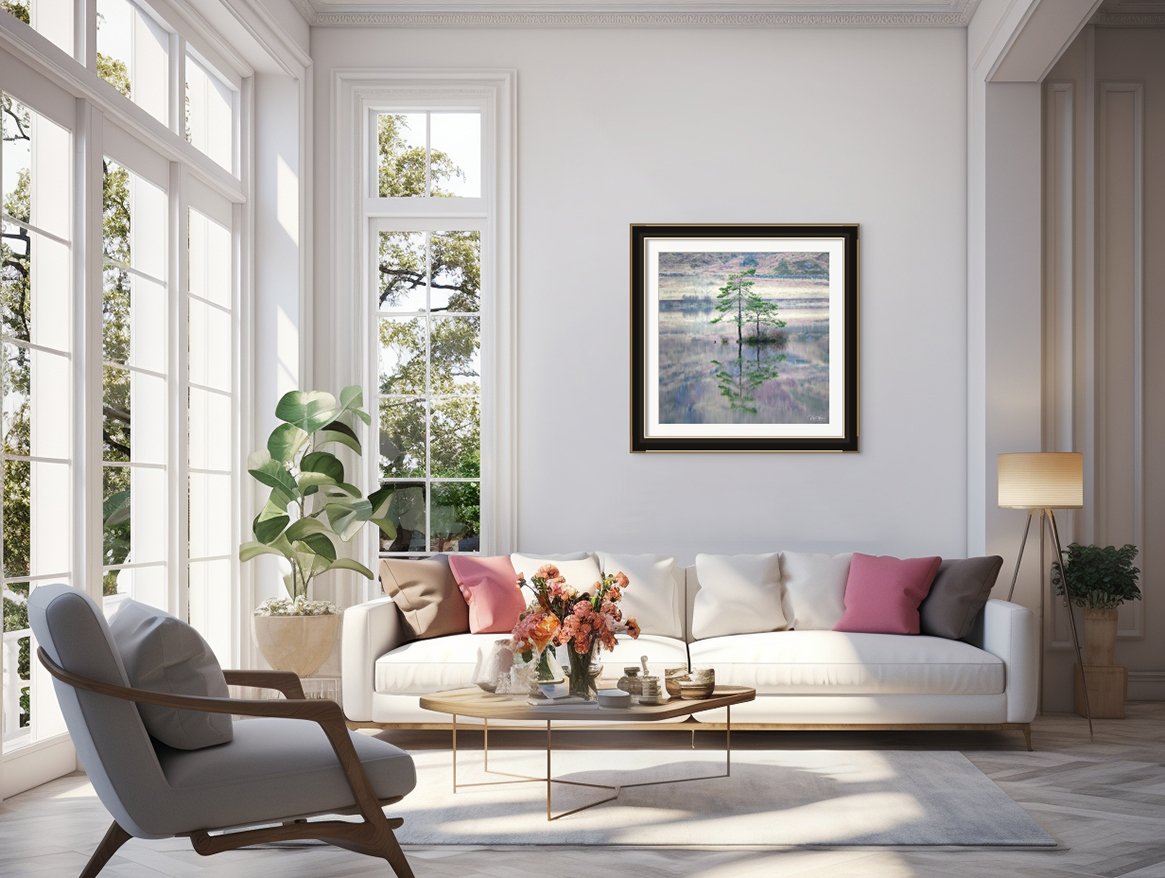 As the viewer gazes upon this scene, they are drawn into a moment of quiet contemplation. The stillness of the loch reflects the timeless beauty of the surrounding landscape, while the two trees, with their unwavering stance, evoke a sense of solemnity and reverence.