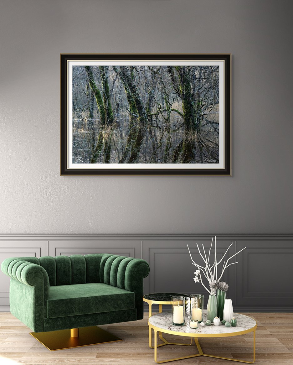 In the mystical depths of a Scottish Highland woodland, where the whispers of ancient tales mingle with the damp earthy scent of moss, Submerged Sovereignty unveils a scene of serene majesty. This photograph captures a moment of quiet reverence as moss-covered trees assert their dominion over the marshland, their trunks submerged in the tranquil waters, like sentinels guarding nature’s silent kingdom.