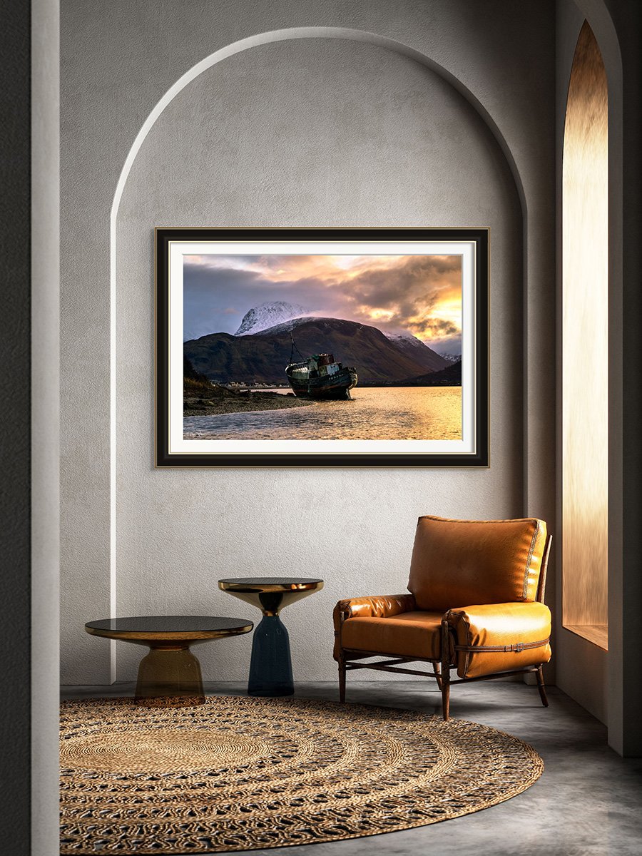 In the shadow of the imposing Ben Nevis, where the Scottish Highlands meet the rugged coastline, lies a silent witness to the passage of time—the shipwreck Golden Harvest, eternally cradled on the shingle of Caol Beach in Corpach. This photograph print captures more than the skeletal remains of a once seaworthy vessel, it unveils a haunting narrative of resilience and the relentless forces of nature simply titled ‘The Corpach Shipwreck’.