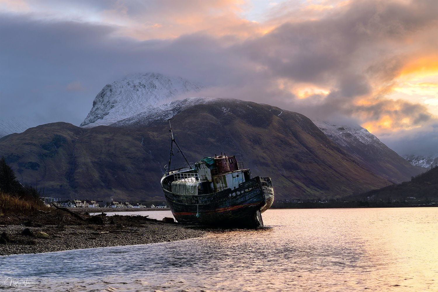 Ben Nevis, the towering guardian, casts its watchful eye over the shipwreck a juxtaposition of the human endeavour against the vastness of nature’s grandeur.