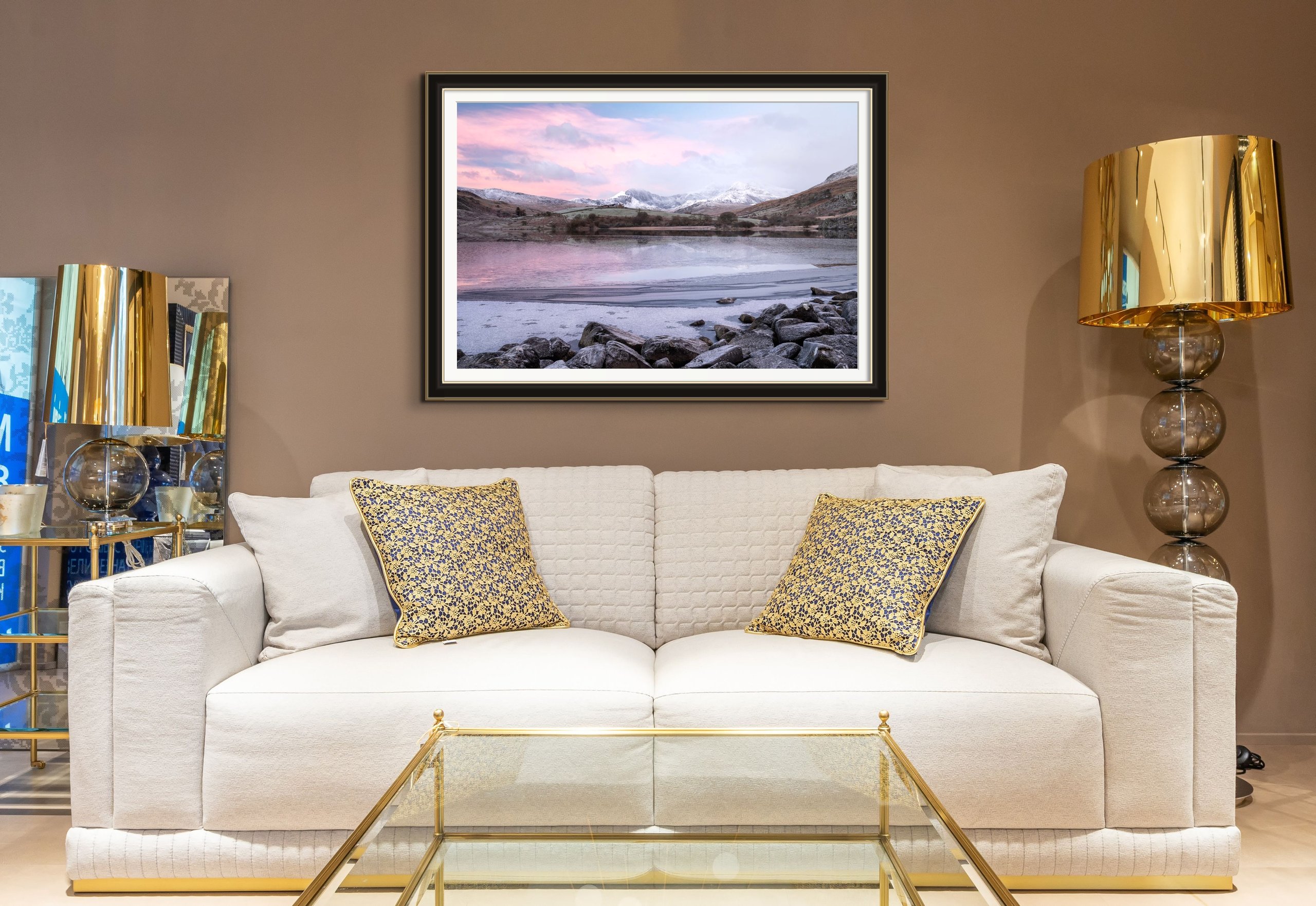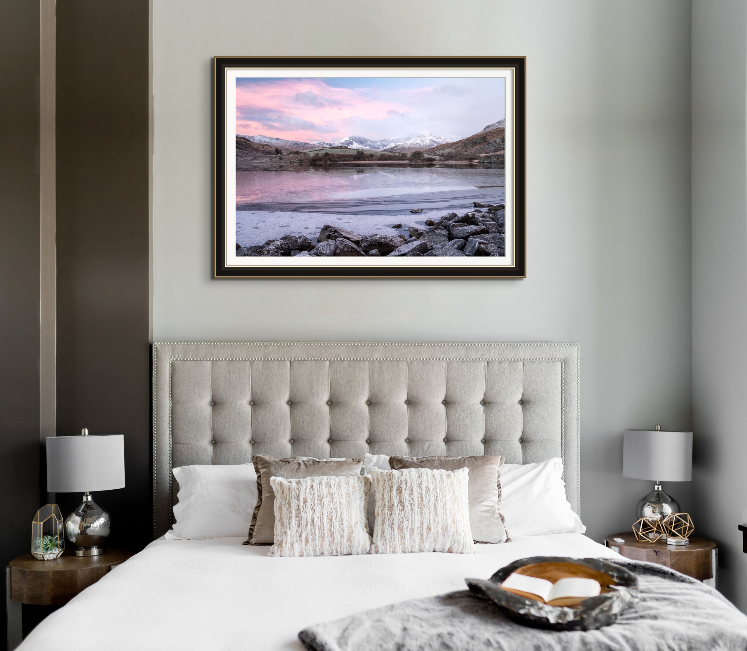 Tranquility of Eryri is an awe-inspiring photographic print that captures the essence of dawn breaking over the enchanting landscapes of Eryri National Park. With the frozen lake as a serene canvas, pastel magenta skies paint an ethereal symphony above the snow-draped mountain range.